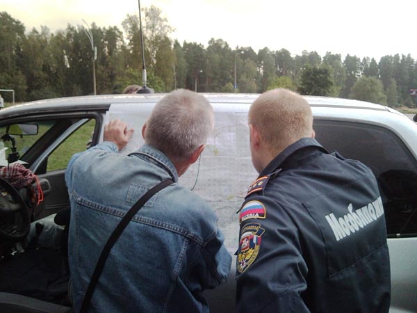 Одна уже была накануне в воскресенье, в понедельник ожидались другие люди – новый координатор с напарником, поисковые карты и много-много навигаторов с ними. По телефону около трёх по полудню мы договорились на пять часов, но, пока то, да сё, приехали они, когда уже четверть седьмого была. Народ-добровольцы уже собрался, родственники пропавшего, «Мособлпожспас» со своей газелью. Я уже было жалеть начала, что ведь могла бы и за справкой успеть съездить. Какие поиски вечером? Я же помню, как нас из лесу тогда попросили, когда темнеть начало в июне, а тут уже сентябрь на дворе. Оказалось, теперь это и есть самое поисковое время, время фонарей и навигаторов. Но я в лес ночью не ходок, даже с прибором ночного видения на голове, я умудрюсь его так потерять, не найдёте потом и днём с огнём. Потому мне поручили клеить карту, т.е. собрать эдакую мозаику из отдельно распечатанных кусочков, да развесить объявления о пропаже на всех известных входах в лес. Карта оказалась большой, ножниц, чтобы обрезать пустые поля тех листков А4, не оказалось, как выход - стали загибать их и собирать прозрачной изолентой. А тут и дождь накрапывать начал, специально что ли ждал, чтоб всю работу смыть… Приходилось прятаться с картой в машине, а когда прекращался дождь – выбираться.