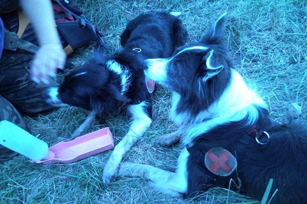 Здесь они лежат усталые после долгой беготни по лесу, некоторые пьют воду из портативных поилок.