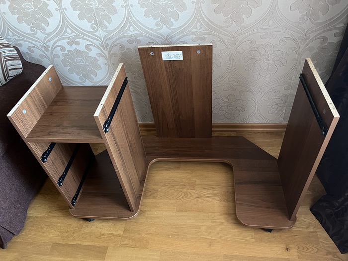 Стол на колёсиках, угловой. Столешница цельная, три секции: средняя с выдвижной полочкой под клавиатуру, левая и правая секции с ящичками и полочками. Цена 1000 руб.