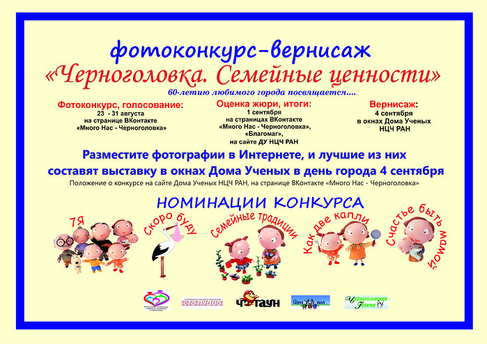 Общественная организация «Центр защиты материнства и поддержки многодетных г.о.Черноголовки» (МногоНас – Черноголовка) совместно с Домом ученых НЦЧ РАН объявляет фотоконкурс «Черноголовка. Семейные ценности», приуроченный к 60-летию Черноголовки! Принять участие в конкурсе могут жители городского округа Черноголовка, достигшие возраста 16+, как профессиональные фотографы, так и любители. Фотографии, отправленные на конкурс, оценит экспертное жюри в каждой из номинаций. Лучшие работы, прошедшие отбор, будут напечатаны и составят выставку «Черноголовка. Семейные ценности», которая 4 сентября, в День города, украсит окна Дома ученых НЦЧ РАН, где ее смогут увидеть все черноголовцы.